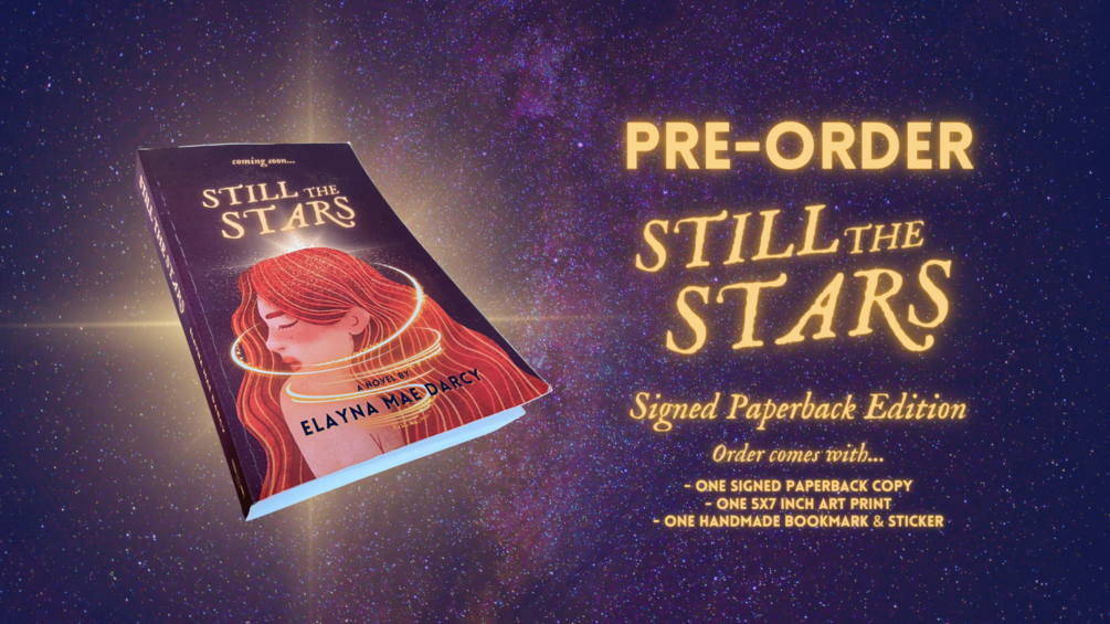 Pre-order of a signed paperback copy of Still the Stars, a handmade bookmark & sticker, and a 5x7 art print